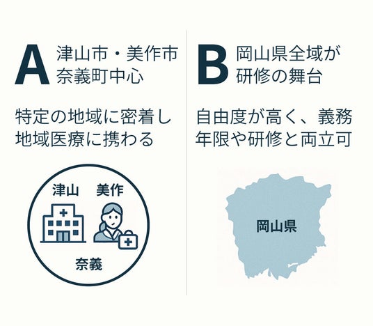 - Aコース:津山市・奈義町・美作市に密着した高密度な地域完結型研修