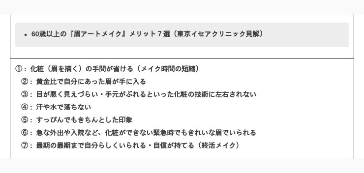 その中より一部抜粋すると、【シルバー世代の方々からは、加齢で目が見えづらくなるにつれ、眉を描くのがわずわしいと感じていた方が「化粧しなくても美しい眉を保つことができて良い」とのお声をいただきます。アートメイクをされた娘さんからの勧めやプレゼントでご来院される患者さまも増えつつあります。