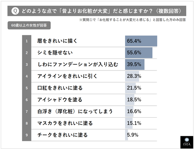 ◎【60歳以上の女性へ「メイク(化粧・眉毛)の悩み」を調査】 1.7割以上「昔と比べて、化粧は大変!」 2.化粧は何が大変? 1位に7割が「眉を描く」、次点に6割「シミ隠せない」と続く