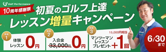 東京都、千葉県、神奈川県、埼玉県、愛知県、滋賀県、大阪府、兵庫県など全国31店舗を展開し、5ラウンド以内に100切り出来なければ全額返金保証で有名なゴルフスクール「ゴルフパフォーマンス」は、2025年に10周年を迎えます!10周年を記念して、レッスン増量キャンペーンが実施中です!