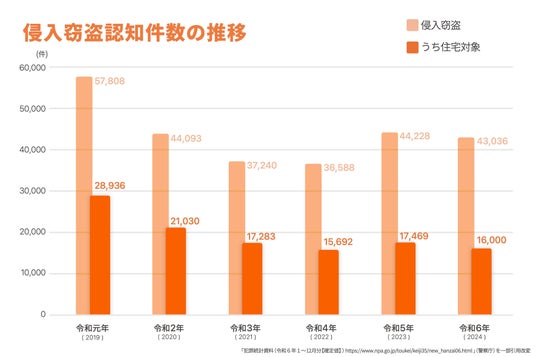 また、住宅を狙った侵入窃盗は長年減少傾向にありましたが、令和5(2023)年には1万7,469件と11.3%の増加。1日あたり48件程度発生している計算となり、被害は深刻です。