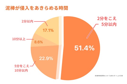 都市防犯研究センターの調査によると、元泥棒の約7割が「侵入に2~5分以上かかると犯行をあきらめる」と答えています。つまり、建物の防犯性能を高めれば、侵入されるリスクを大きく減らすことが可能であり、安心・安全な暮らしを守るためにも耐久性の高い防犯設備の導入が重要といえます。