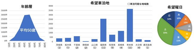 予約者全体の平均年齢は50歳。温泉や自然の豊かな車泊地、特に冬場は焚き火ができる施設が人気で週末やハイシーズンは予約が取り難い車泊地も増えており、車泊スペース数が不足している地域も見えてきました。九州には37ヶ所の車泊地がありますが、宮崎や鹿児島、熊本の天草など車泊ニーズの高い地域や、二次交通の課題がある通過型地域に安心安全な車泊の横展開を図っていきます。