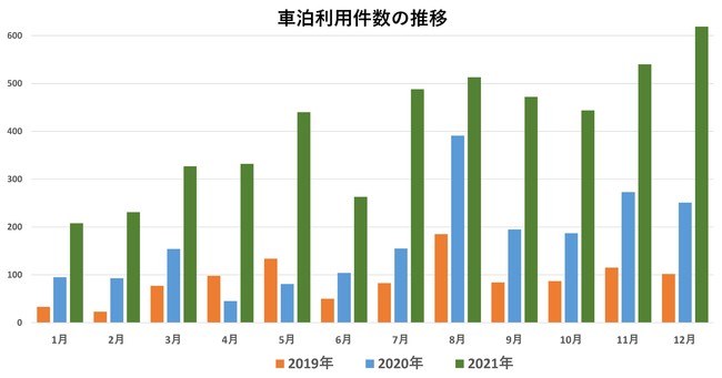 車泊利用件数はコロナ前の2倍→4倍と増加し、2021年の年間リピート率(2回以上利用件数/総利用件数)は43地域で43%とコロナ禍に上昇しています。3年間のリピート率は46%と、密のない自然豊かな地域、隠れた観光スポットなどを巡る利用者が増加しており、2021年12月は過去最高の利用件数を記録しました。