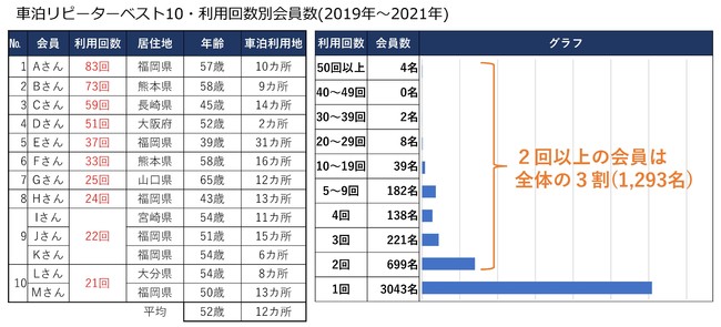 車泊利用者(軒先パーキング登録会員)を見ると、2019年~2021年の3年間で2回以上の会員は全体の3割でリピーター上位10名(キャンピングカーユーザー)の平均年齢は52歳、車泊利用地は平均12ヶ所と九州の上位ユーザーは車泊周遊を楽しまれていることがわかります。