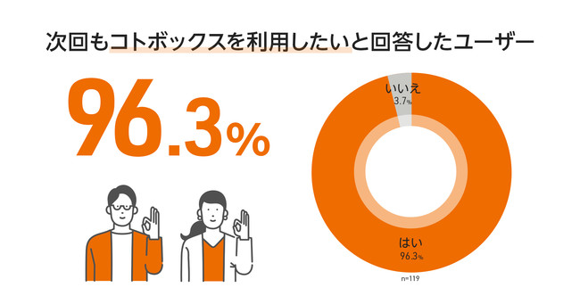 一昨年10月に実施したコトボックスユーザーを対象とするアンケートでは、初めての商標出願でコトボックスをご利用頂けたという回答が88%に上り、商標出願に対するハードルの減段に貢献を示した他、知的財産の分野におけるDXにも影響を与えたことがわかる結果となりました。また、「今後の商標出願予定が1年以内にある」もしくは「未定」と答えた方への質問で、「次回以降の商標出願もまたコトボックスを利用しますか?」という質問に対し、96%のユーザーから「利用する」という回答を頂いております。