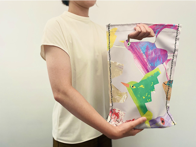 「ART WALL PROJECT」の次なるステップとして、掲示されたアートが世田谷区立玉川福祉作業所の方々の手によってアップサイクル製品として生まれ変わります。そして今回制作するのは、防水加工を活かせるよう多少の雨などに濡れても問題のないバッグです。鳥のアートを最大限活用できるよう、どの箇所を切り取っても鳥が一羽以上入る大きさとシンプルさにこだわりました。