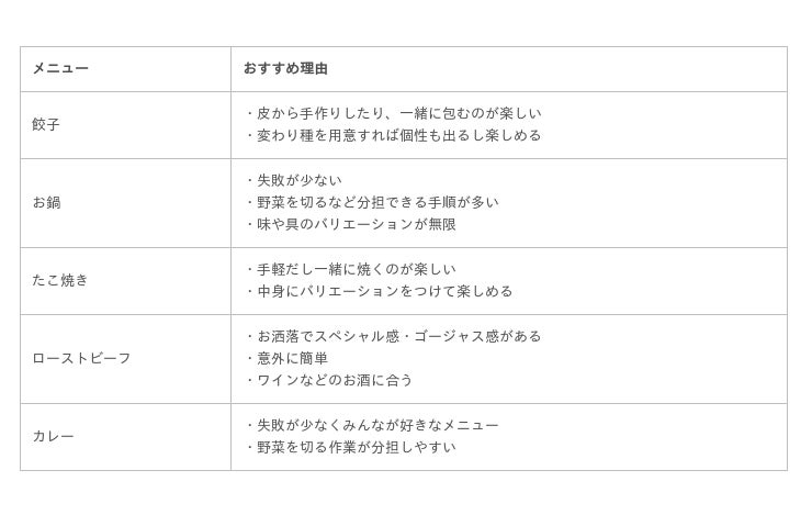 やはり「作業を分担しやすい」「簡単なもの」「一緒に作る過程を楽しめる」といった料理が多いようです。