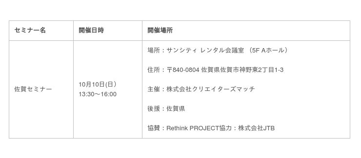 プロフェッショナル人財の育成を通じて、クリエイターに新たな働き方を提案する株式会社クリエイターズマッチが主催する『Rethink Creator PROJECT』は、「Rethink PROJECT」の協賛のもと今年も全国各地で実施しています。4年目となる2021年の地域セミナーは、本取り組みに共感して頂いた全国各地の自治体の後援を受け、これまで16地域17セミナーを開催いたしました。10月10日(日)には、今年最後の開催となる佐賀セミナーを開催いたします。