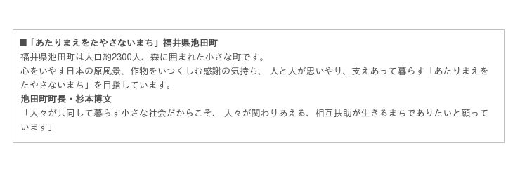 人口約2300人、森に囲まれた池田町は、心をいやす日本の原風景、作物をいつくしむ感謝の気持ち、人と人が思いやり、支えあって暮らす「あたりまえをたやさないまち」を目指しています。