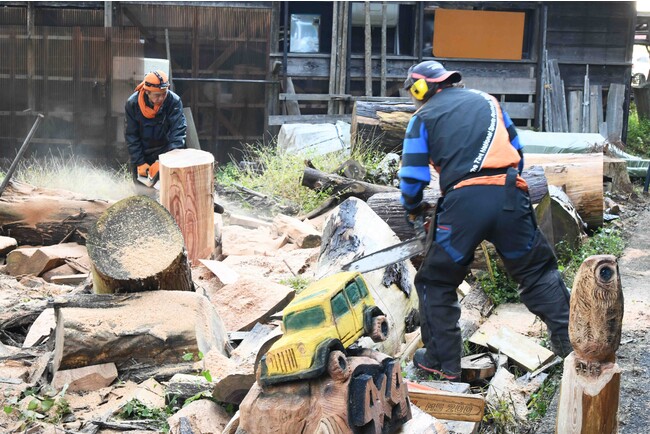 9の出店者が様々な販売企画を展開しました。杉丸太のチェーンソーアートの実演販売や、池田小学校の3・4年生と老人クラブの方が一緒に育てた野菜の販売など、出店者との会話を楽しみながらのお買い物で町が賑わいました。