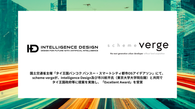 scheme verge株式会社(本社:東京都文京区、代表取締役CEO:嶂南 達貴、以下「scheme verge」)は、国土交通省主催『タイ王国バンコク バンスー・スマートシティ都市OSアイデアソン』にて、Intelligence Design株式会社及び市川航平氏(東京大学大学院総合文化研究科広域科学専攻 福島研究室 博士課程所属)と共同でタイ王国政府等に提案を実施し、「Exellent Award」を受賞しましたのでお知らせします。