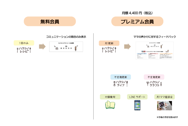 「ハクコジ」のプレミアム会員に登録(月額4,400円(税込))いただくことで、オンライン知育コンテンツの利用と保護者へのコミュニケーションに対するフィードバックを利用いただけます。(※対象コンテンツのみ)
