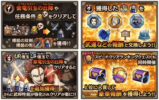 新イベント『電光石火の双刃』のイベントクエストに、新武将『リン玉』を編成すると、交換用アイテムが追加でドロップ!報酬アイテムへの交換が容易になります!