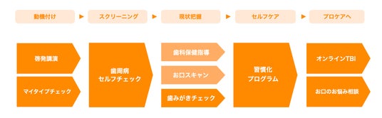 『SmileScan』アプリでは、より良い口腔セルフケアを習慣化するため、アプリを通じて歯科衛生士が伴走するプログラムをはじめ、利用者の継続的な口腔ケアをサポートするさまざまな機能が搭載されています。歯みがき習慣や生活スタイルを分析し、個々に最適なケア方法を提案する『マイタイプチェック』やオンライン問診による『歯周病セルフチェック』機能により、まず口腔ケアにおける利用者の現状を把握します。そして、それぞれのお口の状態に応じた口腔ケアに関する動画やe-ラーニングによる歯みがき指導により、知識やノウハウを提供します。さらに正しい口腔ケアを継続しやすい仕掛けが組み込まれた3ヶ月間のコーチングプログラムにより習慣化を促します。