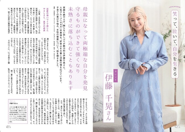 笑顔を絶やさず、飾らない話しぶりが魅力的な伊藤千晃さん。人気グループ『AAA』 卒業後も、好奇心を大事に活動の場を広げています。子育ての喜びや悩み、女性の健康についてお話を伺いました。