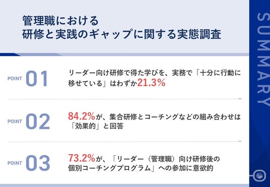 ビジネスコーチグループ B-Connect株式会社(本社:東京都港区、代表取締役社長:杉本 博史)は、従業員数1,000名以上の企業に勤務し、リーダー(管理職)向け研修を受講した経験のある管理職(本部長・部長・課長) 108名を対象に、管理職における研修と実践のギャップに関する実態調査を実施しましたので、お知らせいたします。