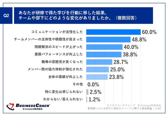 Q1で「十分に行動に移せている」「ある程度行動に移せている」と回答した方に、「Q2.あなたが研修で得た学びを行動に移した結果、チームや部下にどのような変化がありましたか。(複数回答)」(n=80)と質問したところ、「コミュニケーションが活性化した」が60.0%、「チームメンバーの主体性や積極性が高まった」が48.8%、「問題解決のスピードが上がった」が40.0%という回答となりました。