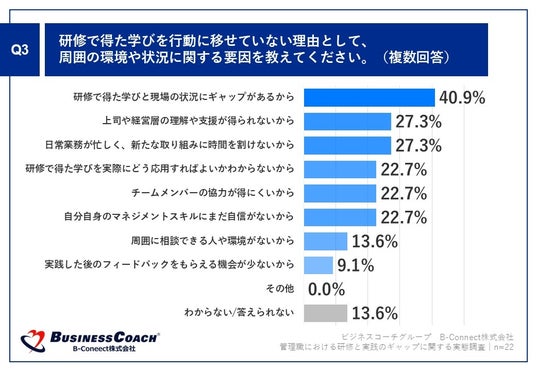 Q1で「行動に移そうと試みたが、うまくいっていない」「ほとんど行動に移せていない」と回答した方に、「Q3.研修で得た学びを行動に移せていない理由として、周囲の環境や状況に関する要因を教えてください。(複数回答)」(n=22)と質問したところ、「研修で得た学びと現場の状況にギャップがあるから」が40.9%、「上司や経営層の理解や支援が得られないから」が27.3%、「日常業務が忙しく、新たな取り組みに時間を割けないから」が27.3%という回答となりました。