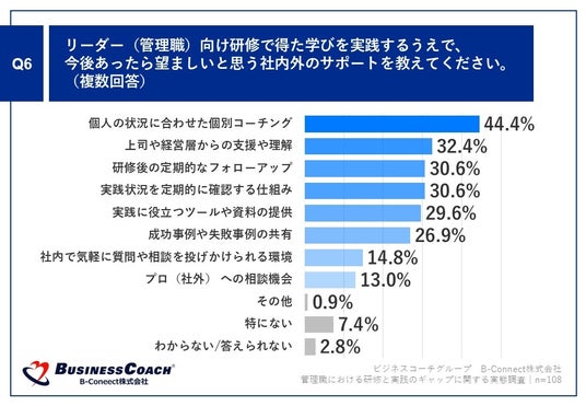 「Q6.リーダー(管理職)向け研修で得た学びを実践するうえで、今後あったら望ましいと思う社内外のサポートを教えてください。(複数回答)」(n=108)と質問したところ、「個人の状況に合わせた個別コーチング」が44.4%、「上司や経営層からの支援や理解」が32.4%という回答となりました。