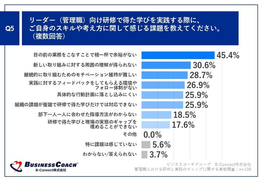 「Q5.リーダー(管理職)向け研修で得た学びを実践する際に、ご自身のスキルや考え方に関して感じる課題を教えてください。(複数回答)」(n=108)と質問したところ、「目の前の業務をこなすことで精一杯で余裕がない」が45.4%、「新しい取り組みに対する周囲の理解が得られない」が30.6%、「継続的に取り組むためのモチベーション維持が難しい」が28.7%という回答となりました。