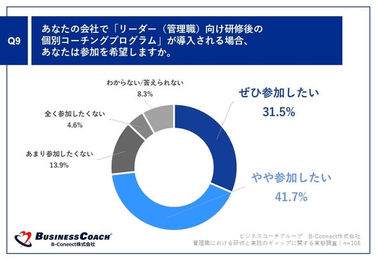 「Q9.あなたの会社で『リーダー(管理職)向け研修後の個別コーチングプログラム』が導入される場合、あなたは参加を希望しますか。」(n=108)と質問したところ、「ぜひ参加したい」が31.5%、「やや参加したい」が41.7%という回答となりました。