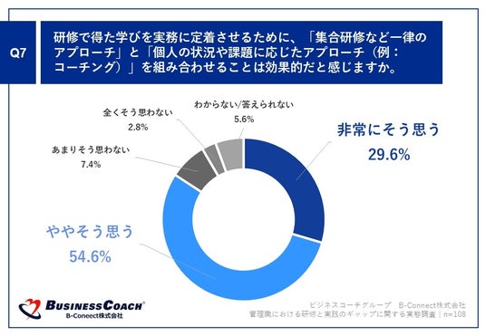 「Q7.リーダー(管理職)向け研修で得た学びを実務に定着させるために、『集合研修など一律のアプローチ』と『個人の状況や課題に応じたアプローチ(例:コーチング)』を組み合わせることは効果的だと感じますか。」(n=108)と質問したところ、「非常にそう思う」が29.6%、「ややそう思う」が54.6%という回答となりました。