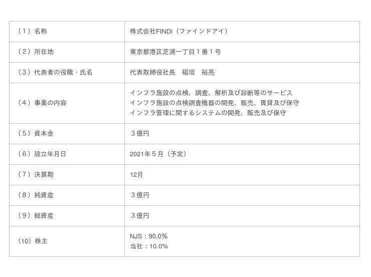 当社は、2020年8月14日に開示した中期経営方針「ACSL Accelerate FY20」に基づき、用途特化型機体の1つである閉鎖環境点検ドローンを本格展開すべく、株式会社NJS(以下、「NJS」)と共同出資で株式会社FINDi(以下、「本JV」)を設立することを決議しましたので、お知らせいたします。