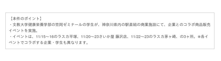 文教大学健康栄養学部の笠岡誠一ゼミナールは、11月15日(金)より、神奈川県内各地で企業とのコラボ商品販売イベントを実施します。