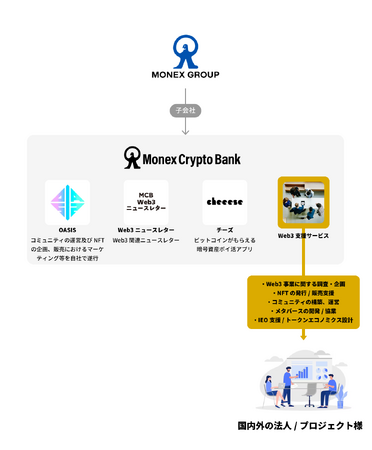 マネックスクリプトバンク株式会社(本社:東京都港区、代表:万代惇史、以下「MCB」)は、新サービスとして「Web3支援サービス」を開始します。本サービスは、Web3関連事業への参入を検討する国内外の法人/プロジェクト様向けに、幅広いソリューションを提供します。Web3の幅広いバリューチェーンの中において、MCBの暗号資産およびブロックチェーン事業をはじめとするweb3領域の知見・経験を活かし、リサーチ、NFTの企画から発行、コミュニティ構築、運営等、様々なサポートをさせていただきます。