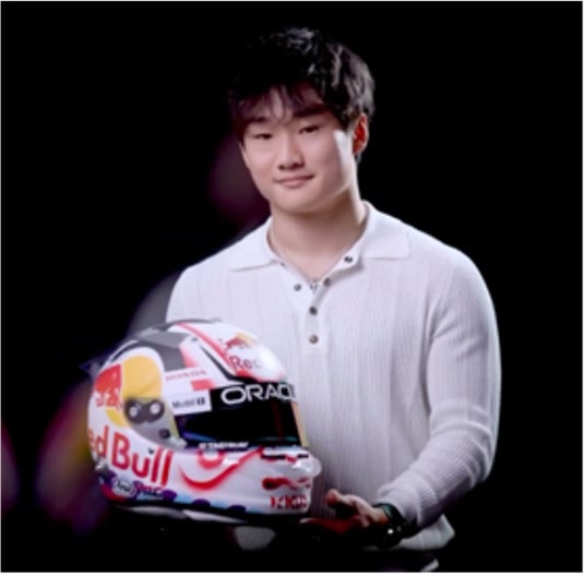 ヘルメットを被り、オラクル・レッドブル・レーシングで走ります!応援、よろしくお願いします!