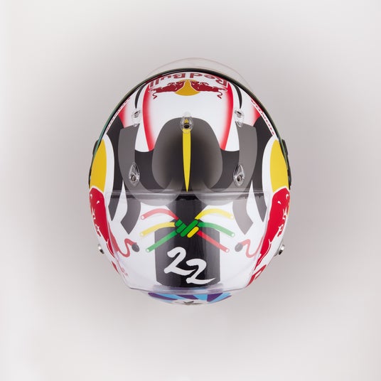 歌舞伎役者でF1日本GPの公式アンバサダーを務める市川團十郎さんがデザイン監修。市川團十郎家に代々伝わる家の芸、歌舞伎十八番の内『暫(しばらく)』をモチーフに、隈取や仁王襷をあしらったデザインとなっており、後頭部には市川團十郎直筆のカーナンバー「22」が描かれています。正面の口元にはRDSのロゴも描かれています。