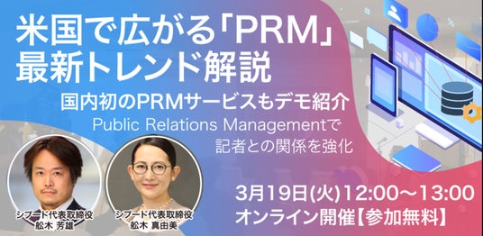 「経営機能としての広報・PR」への意識が高い米国では、広報部のみならずマーケティングや事業推進、営業などがPRMを導入し、メディアとの関係性構築を戦略的に実行する企業が増えており、主要ツールとしてPRM大手の米国Mack Ruck社が急成長しています。当社は今月、国内で初めて、PRMプラットフォームを提供しました (自社調べ、2024年3月時点)。これを記念したオンラインセミナーを3月19日に予定しています。