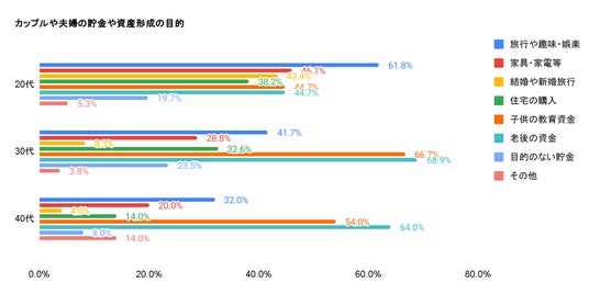 具体的に「教育資金」を目的とする割合は30代で66.7%、40代で54%にのぼり、「老後資金」も30代で68.9%、40代で64%と、他の項目を大きく上回る高い比率となりました 。