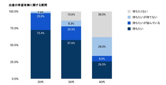 出産の希望有無に関する調査では、20代で100% 、30代でも86.4%が「出産を希望する」と回答しました。一方で、その内訳を見ると「持ちたいが悩んでいる」「持ちたいが持てない」という層が20代で27.6% 、30代で28.8% に達しています。