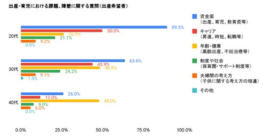20代:89.5%が「資金面(出産、育児、教育費等)」を最大の課題として回答しました。
