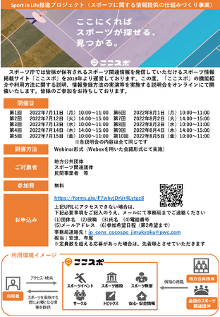 スポーツ庁では皆様が保有されるスポーツ関連情報(大会や教室などの情報)を発信していただけるスポーツ情報掲載サイト「ここスポ」(https://cocospo.go.jp/)を運営しており、今年度もオンライン会議システム(webex)を用いて以下の日程で説明会を開催いたします。