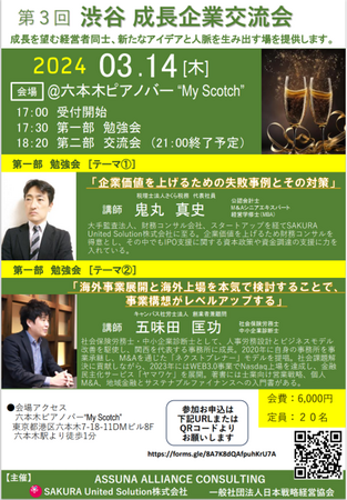 SAKURA United Solution株式会社、および一般社団法人 日本戦略経営協会は、成長・IPOを目指す起業家と、経営支援専門家が交流する場として、「渋谷成長企業交流会」を2024年3月14日(木)に六本木ピアノバー MY SCOTCHにて開催いたします。