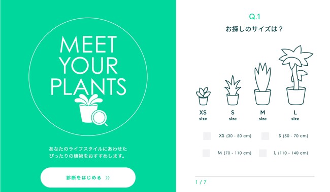 まずはじめに、どのような植物が自分の暮らしには合っているのか「パーソナル植物診断」を実施。AND PLANTSのWEBサイト( https://andplants.jp/ )からすぐに受けられる「パーソナル植物診断」は、求めている植物の大きさや育成環境、ご自身の性格や好みなど、さまざまな観点からの質問に選択肢で回答し、ほんの数分で診断結果(おすすめの植物)が分かるという機能です。