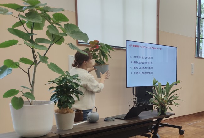 「2. 植物の育て方を学ぶ」では、植物の育て方の基本やうまく育てていくためのコツについて、クイズも交えながらレクチャー。実際にさまざまな観葉植物を見せながら佐藤が説明するなか、参加者の皆さんは深く頷いたり、メモを取られたりと興味津々にお話を聞いていました。