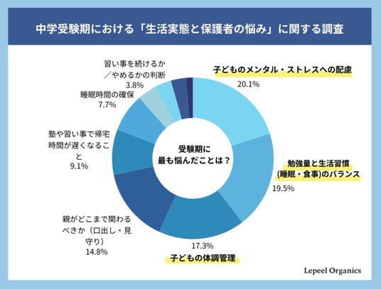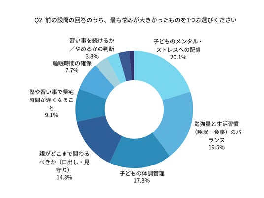 「子どものメンタル・ストレスへの配慮」(20.1%)と「勉強量と生活習慣のバランス」(19.5%)が他の悩みを上回る結果となりました。
