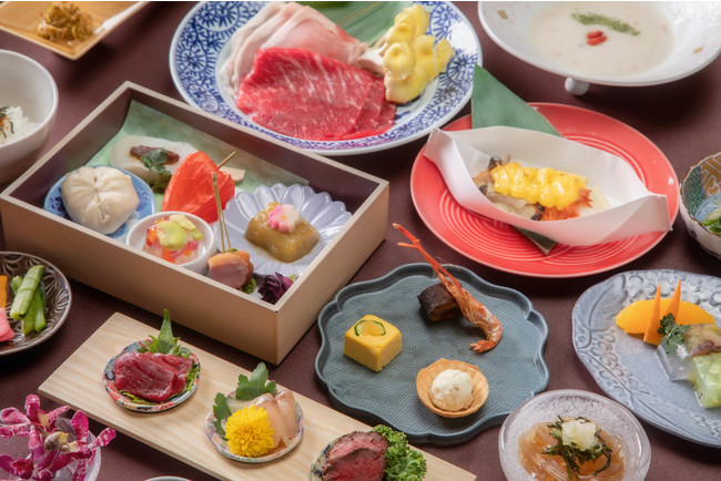 館内にはCGと音楽を融合したヒーリングアートも設置。お食事は【個室料亭】にて地産地消の創作和会席を一品一品提供。