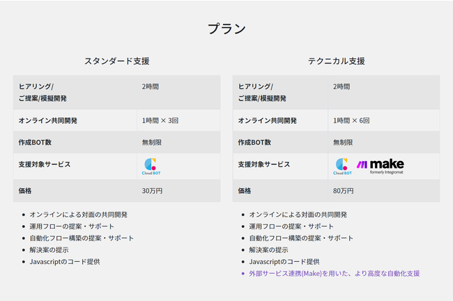 RPAによる単純作業の自動化のみを希望される方に向けた「スタンダード支援」とiPaaSを含めたアプリケーション間のデータ連携を必要とする場合にご利用頂ける「テクニカル支援」をご用意。