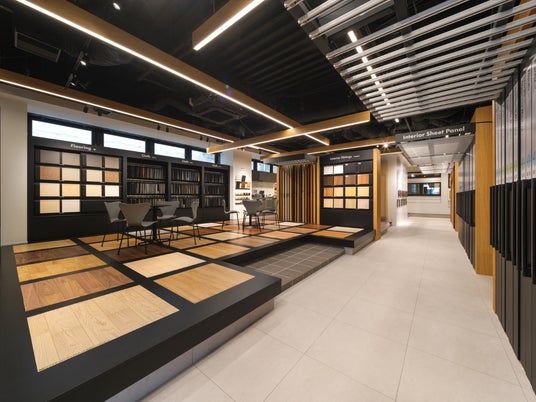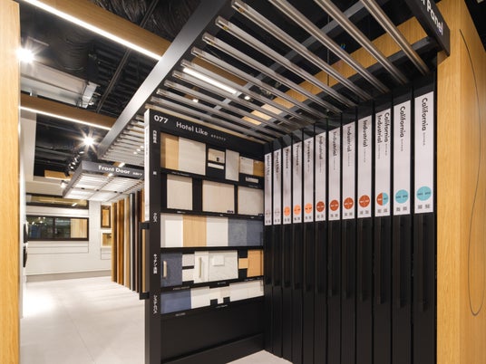展示スペース内には、プロのデザイナーがトータルコーディネートした、床や壁紙・建具・水回りのサンプルセットを全102種ご用意。靴を脱いで、床材の素材感を実際にご体感いただけるスペースも。什器に面材のサンプルをセットすれば比較・確認も可能です。