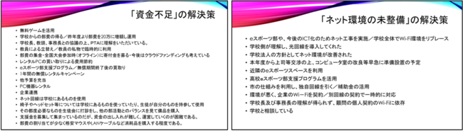 まず一つ目は「ゲームPCの導入困難」。高橋氏は「ゲームPCはやはり値段が高いですので、どうやって導入するのかということが顧問の先生・学校の課題になることが1番目に挙げられました。どのようにして解決したかを見ていくと、例えばサードウェーブさんの部活動支援プログラムを利用したとかですね、職員会議で承認をいただいて学内予算を獲得した、それからゲームPC貸与事業を利用した、あとは県からの対応があったという事例もありまして、いろんな形で解決されています。」と、各校の事例を挙げました。