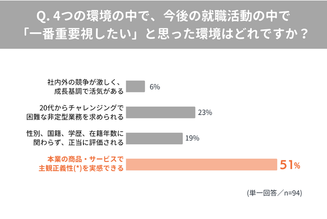 エン人材教育財団が提唱する「人が育つ4つの環境」の中で就活で一番重要視したい環境を単一選択する設問では、51%の学生が「本業の商品・サービスで主観正義性(*)を実感できる」を選択しました。理由としては「サービスや商品に誇りをもって働きたい」「働く意義に直結する」「自分の正義感が潰されない環境を重視したい」などが挙がりました。