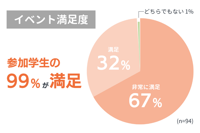 参加後アンケートでは、満足度「5:非常に満足した」を67%の学生が選択、満足度「4」以上で見ると99%でした。