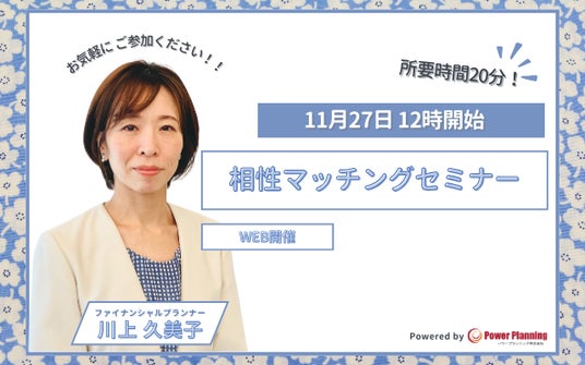 無料マネーセミナー提供サービス「アットセミナー」を運営しているパワープランニング株式会社が「11月27日 (水)12時」に川上 久美子講師によるオンラインの相性マッチングセミナー開催を実施いたします。