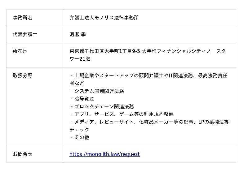 弁護士法人モノリス法律事務所は、「企業ITを進化する」をミッションに掲げています。企業にとってITが不可欠の時代に、法務の視点を持つことは、リスク回避や事業の成長において最重要となっています。私たちは、法律家とITコンサルタントによって構成された、IT法務に強みを持つ集団です。
