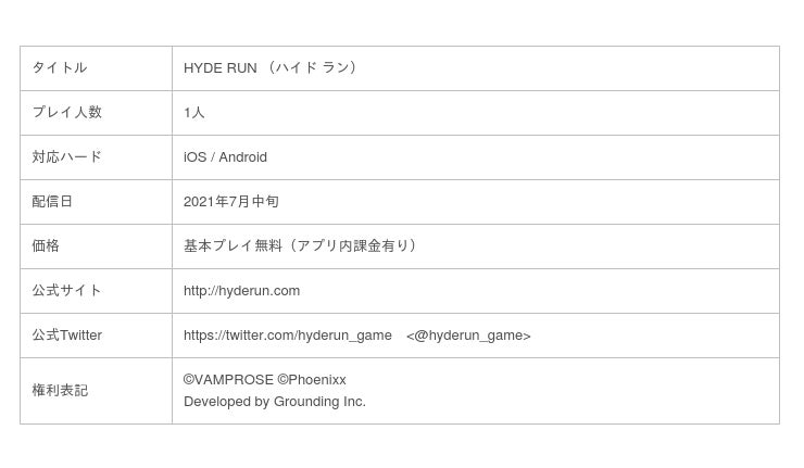 株式会社Phoenixx(フィーニックス)(東京都千代田区、代表取締役社長:坂本 和則)は、HYDEのソロ活動20周年を記念したスマートフォン向けゲーム『HYDE RUN』の配信を2021年7月中旬に決定し、本日よりApp Store / Google Playにて事前登録を開始したことをお知らせいたします。